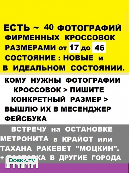 * Есть Кроссовки фирменные. Каждая пара имеет свой конкретный размер, фирму, цену, которые написаны на каждой фотографии. Кроме представленных нескольких фотографий есть ещё больше 30 фотографий кроссовок в размерах от 17 до 46 > кому надо > напишите КОНКРЕТНЫЙ размер / ы > вышлю эти фотографии на Вашу электронную почту ( мой E-mail : now4@yandex.ru ). Состояние кроссовок : новые и в идеальном состоянии.